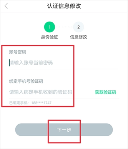 3、在接下来的步骤中,请准确输入当前密码以及收到的短信验证码,确认无误后,点击“下一步”。