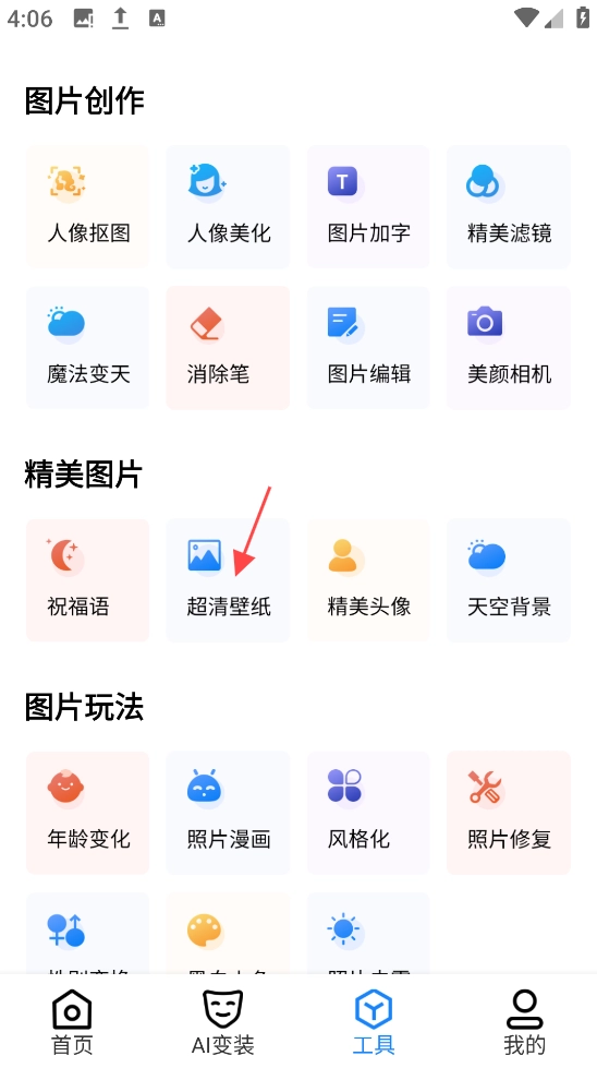 先找到“工具”相关的页面入口,进入后找到“超清壁纸”的功能选项并打开,接着在展示的壁纸中挑选自己喜欢的,最后点击对应的设置按钮就能完成壁纸更换了。
