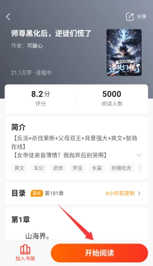 进入小说的详情页面后,找到并点击“开始阅读”这个按钮,就能立即查看小说的全部章节内容了。