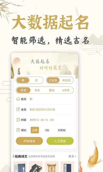 天铭宝宝起名软件不仅深入剖析了传统的五行用字规律,还巧妙融合了古文诗词曲赋中的文采意蕴,是各位宝爸宝妈为宝宝起名时的优选工具。