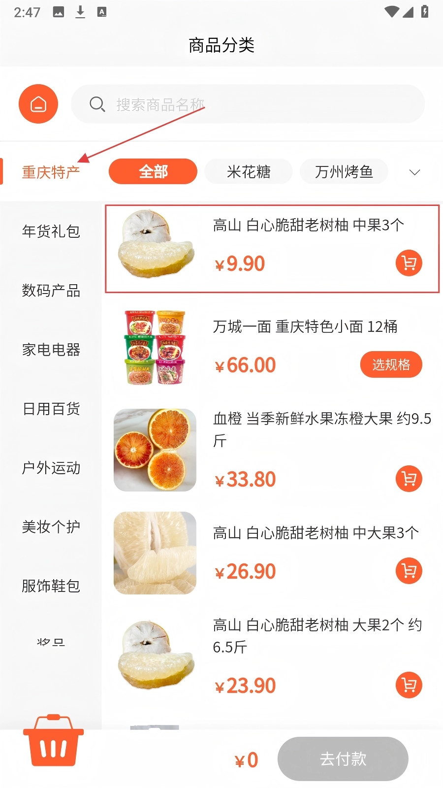 进入商品分类页面后,在【重庆特产】分类下挑选所需商品,随后进入该商品的详情页面。