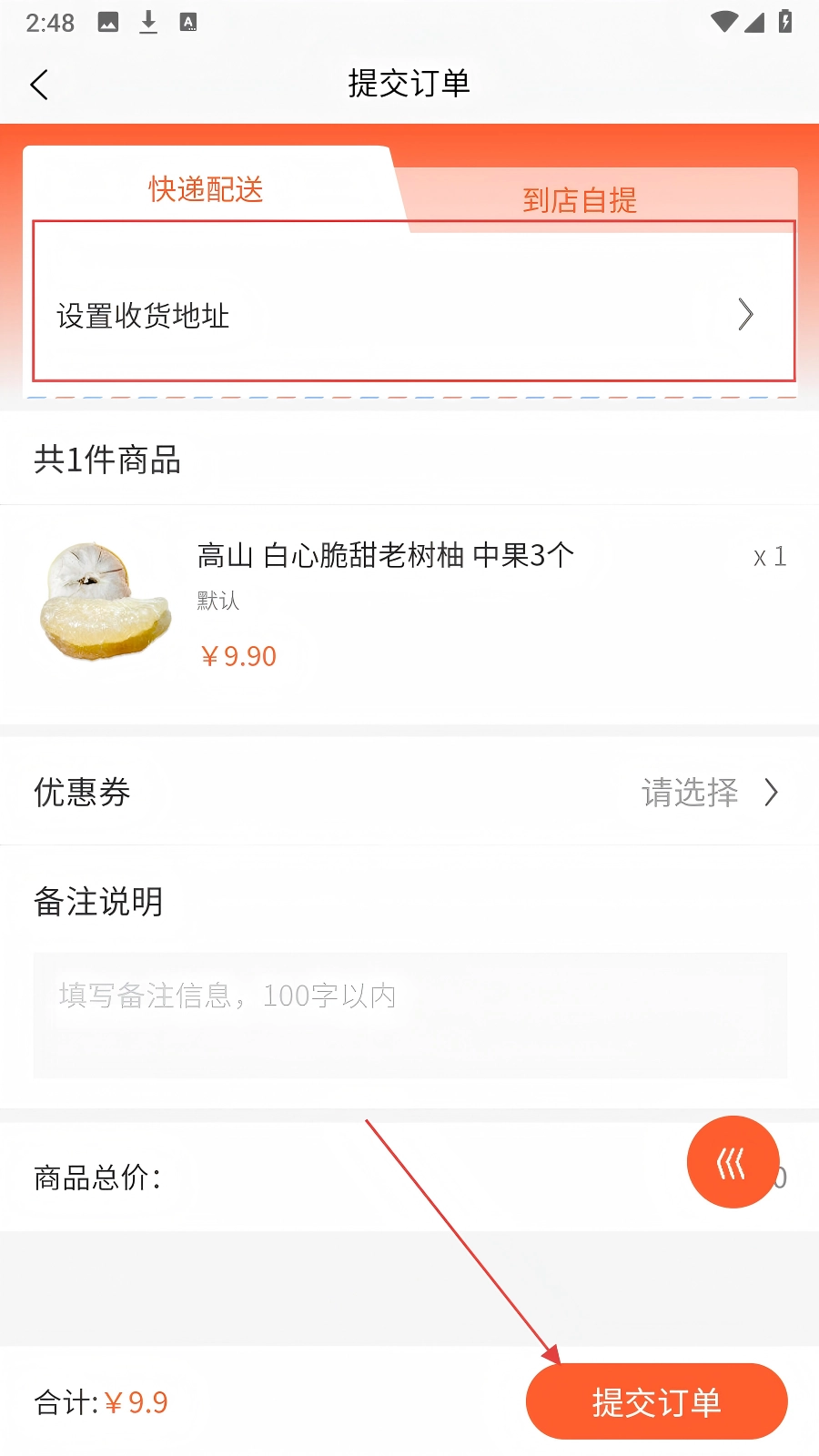 在订单页面设置好【收货地址】后,点击【提交订单】按钮即可完成购买流程。