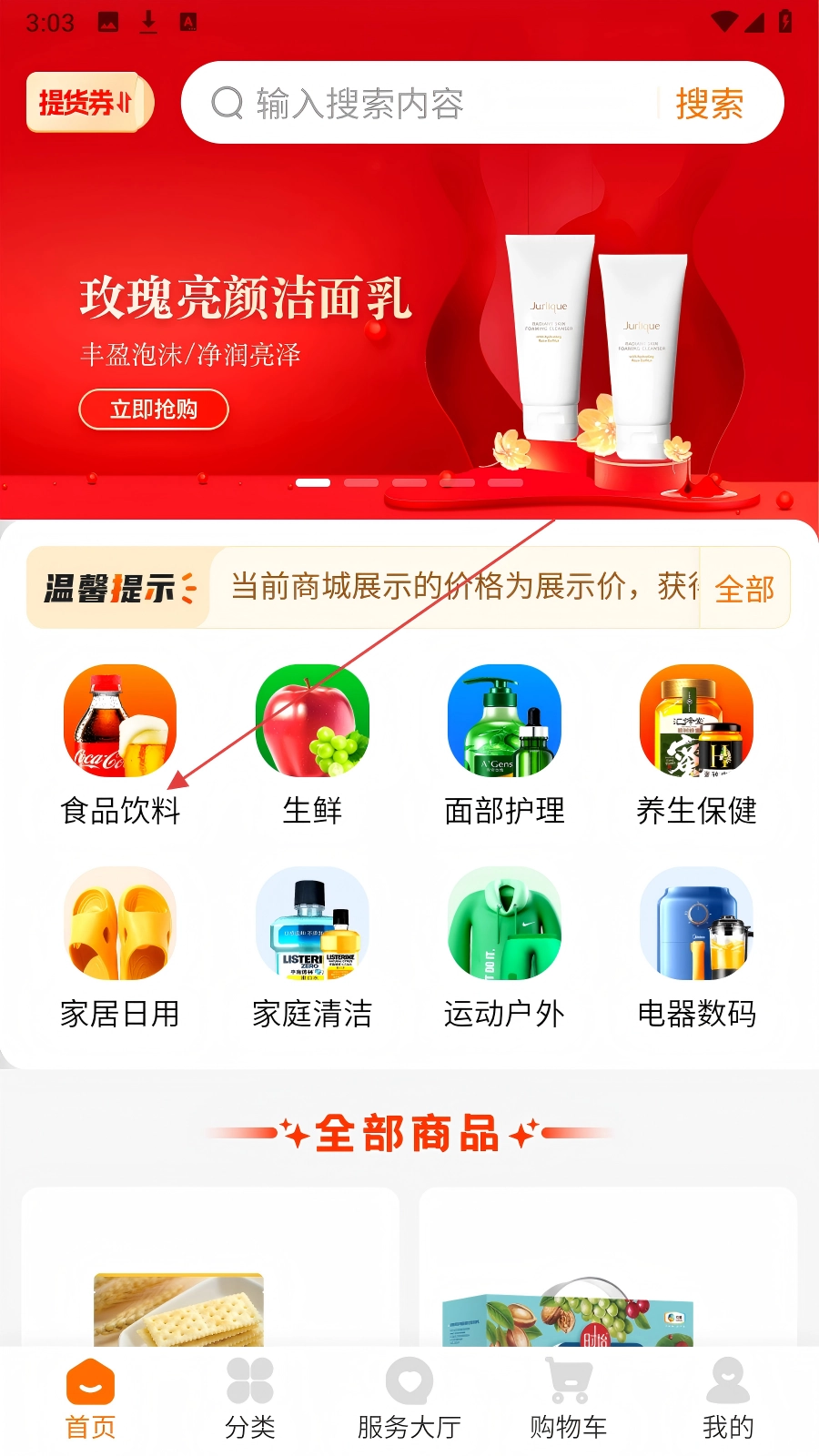 打开商城主页后,找到“食品饮料”的分类入口并点击,接着查看该分类下展示的各类商品。
