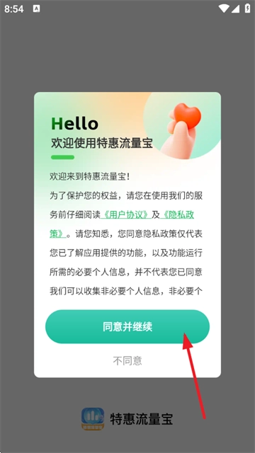 首先打开你的特惠流量宝应用,仔细阅读并同意《用户协议》和《隐私政策》。