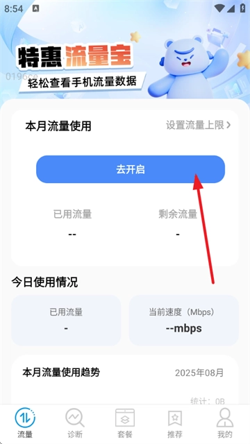 基础数据呈现:点击 “去开启” 激活监测,已用、剩余流量直观展示,今日流量使用量和当前网速也清晰呈现,直观掌握流量动态 。