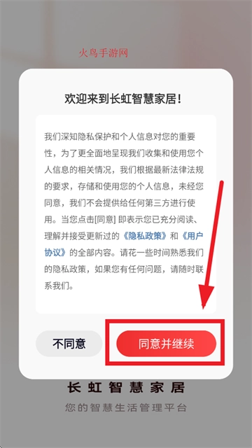 请先完成长虹智慧家居应用的安装操作,随后启动该应用。当界面显示“欢迎来到长虹智慧家居!”的提示信息时,点击“同意并继续”按钮以进入下一步。