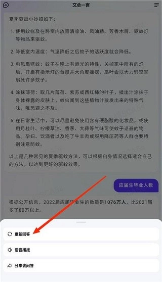 用户自然也能选择重新回答,人工智能会重新思考并给出不同的答案,要是对回答满意,还可以分享给其他人。