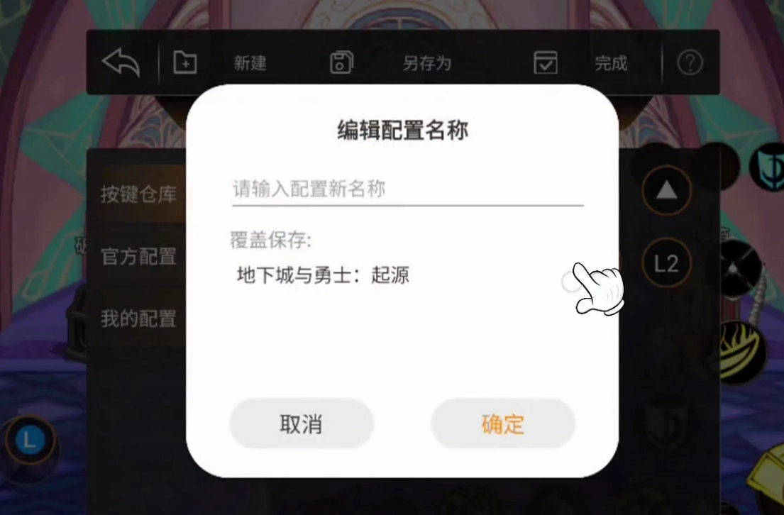 先点击创建新配置,再从按键资源库中把左摇杆等虚拟按键拖拽到功能键区域并调整至对齐状态,之后进行另存操作,在保存选项中选择覆盖原有游戏配置完成保存。