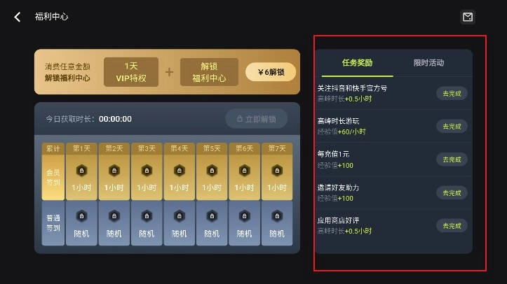 通过完成右侧的任务或者签到可以免费获得时长