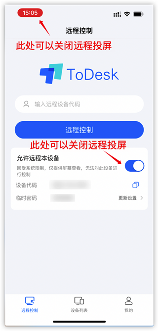 点击ToDesk选项右侧的开关,将其开启至蓝色状态(见下图),这样另一部手机的设置就完成了。
