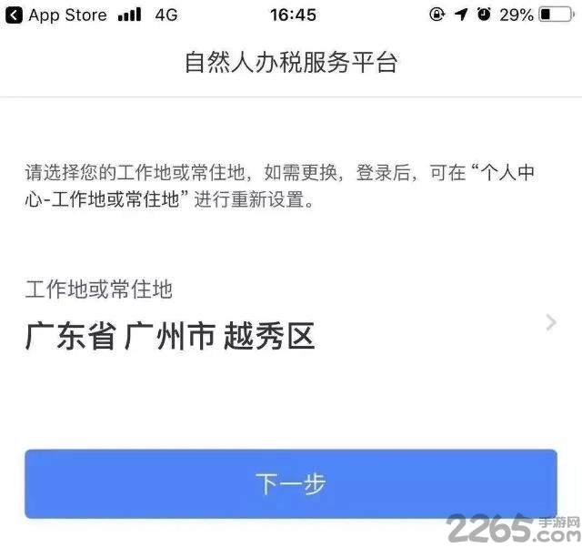 之后,打开2265,找到工作地或常住地的下拉列表,例如选择“广东省广州市越秀区(县)”,再点击“下一步”按钮。
