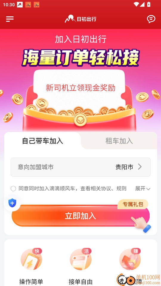 之后可以选择“自带车辆加入”模式,再选定意向加盟城市,点击“立即加入”按钮。