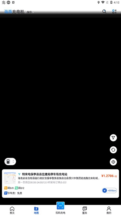 打开应用后,您会在主页面上方看到一排功能图标;这些功能分别是“地图”(可展示附近的充电桩与充电站)、“服务”(能提供城市充电桩分布、资讯以及常见问题解答等各类实用信息)、“扫码充电”(通过手机扫描充电桩上的二维码即可进行充电操作)和“我的”(用于管理个人账户信息和支付方式)。
