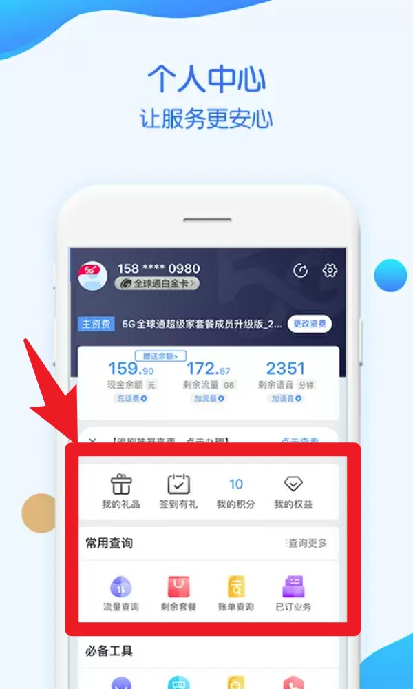 进入“个人中心”,可以查看余额、积分、已订业务等各类信息,还能查询账单以及通过签到领取奖励。