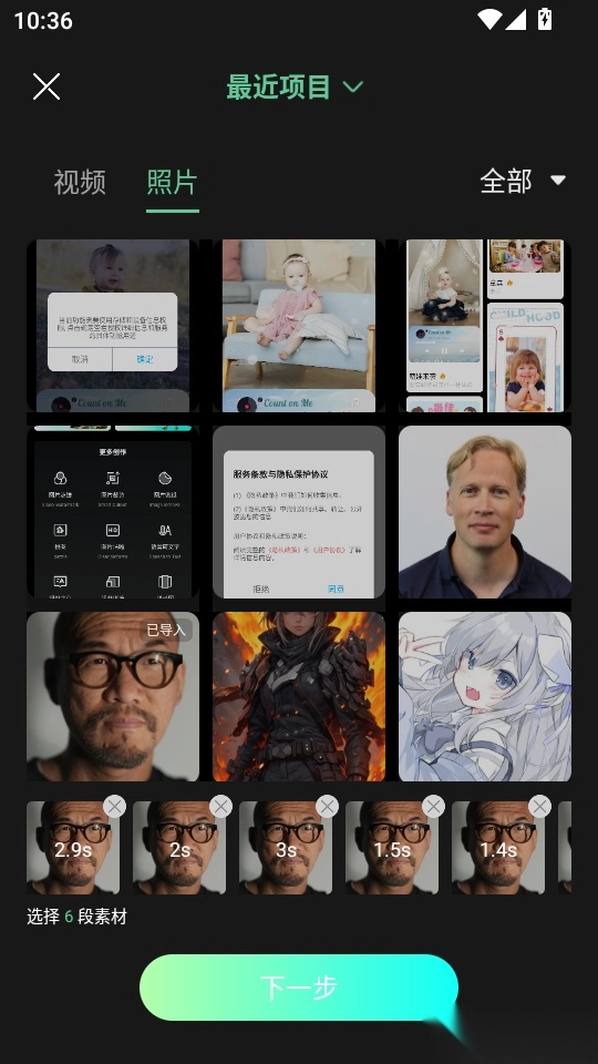 6然后大家把相册里的视频和照片文件添加进去,就能点击“下一步”生成同款视频了。