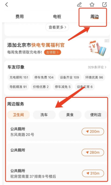 你也可以通过【选择充电场站-点击周边】的方式查询到周边的服务设施。