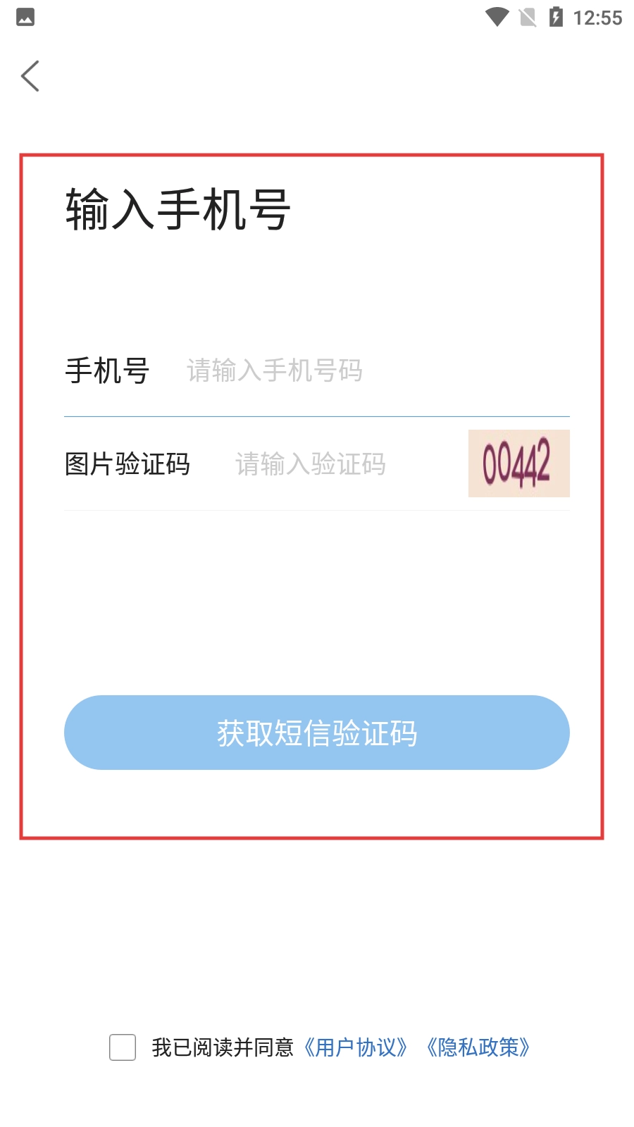 请先输入手机号码与图片验证码,接着点击【获取短信验证码】按钮,同时勾选同意用户协议和隐私政策的选项,以此完成整个注册流程。