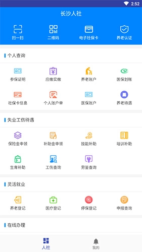 在长沙人社软件的首页上方,点击【二维码】或【电子社保卡】选项,就能查看电子社保卡以及对应的二维码。