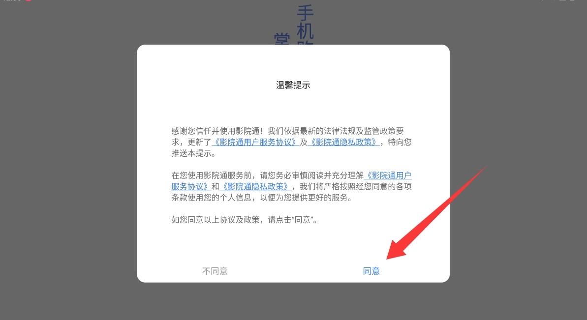 打开影院通购票软件,首次使用时要勾选服务条款和隐私声明,确认无误后就会跳转到首页界面。