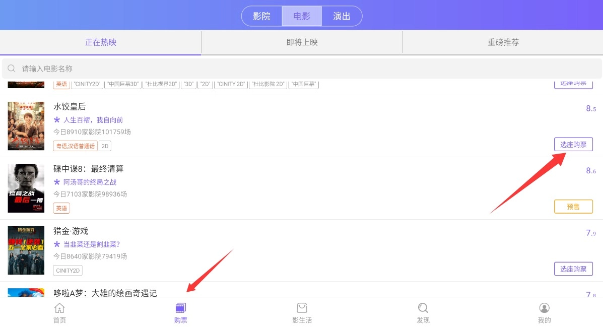 切换到购票页面,选好心仪影片后点击选座购票按钮,完成在线选座和支付步骤。