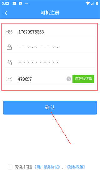 在司机注册页面填写手机号码、密码和验证码,勾选相关协议后点击【确认】按钮,即可完成司机账号的注册流程。