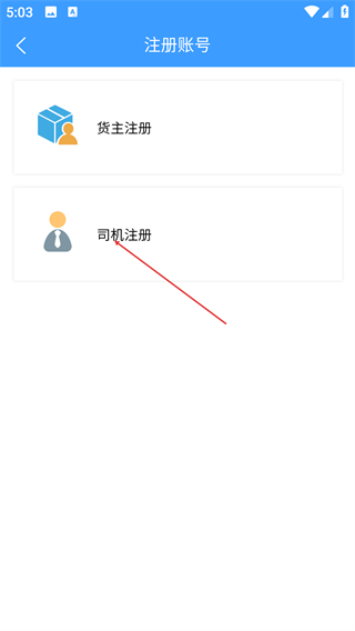 进入账号注册页面后,依据自身身份选择【货主注册】或【司机注册】选项,点击对应按钮即可进入相应的注册流程。