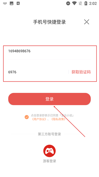 在【手机号快捷登录】页面,输入手机号和收到的验证码,勾选相关协议后点击【登录】按钮即可完成登录;此外,还能选择第三方登录或游客登录这两种方式。