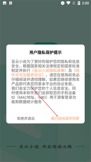 打开应用后,会弹出【用户隐私保护提示】,需要阅读【呈云小说隐私政策】和【软件许可及服务协议】,点击【我已经阅读并同意】才能继续。