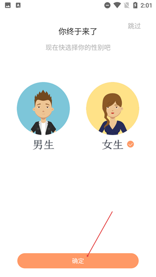 进入性别选择界面后,你可以选择【男生】或者【女生】这两个选项。选好之后,点击界面下方的【确定】按钮即可;当然,你也可以直接点击右上角的【跳过】按钮。