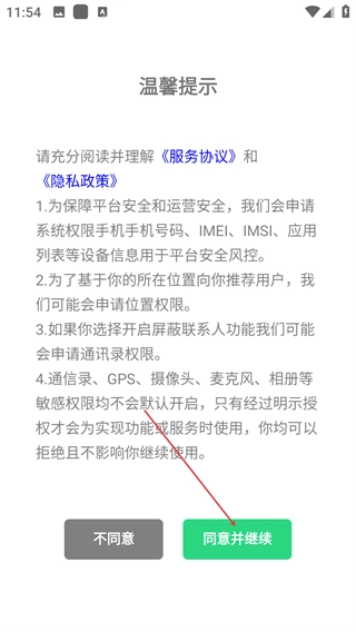 打开应用后,仔细阅读《服务协议》与《隐私政策》,随后点击【同意并继续】按钮,完成协议确认环节即可进入应用。