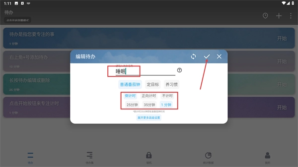 在待办编辑页面,你可以修改待办事项的名称(例如更改为“睡眠”),挑选计时模式(比如倒计时)并设定好时长,最后点击确认按钮,就能完成这次编辑操作。