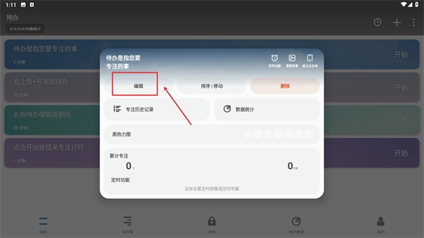 长按对应的待办条目,待操作菜单弹出后,选择【编辑】选项,即可进入待办的编辑界面。