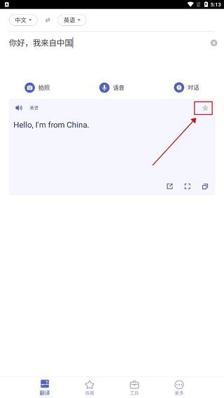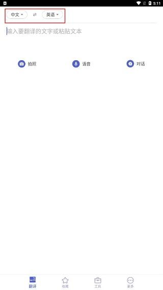 这款软件的操作界面和谷歌翻译颇为相像,整体布局简洁清爽,其首页设有翻译、收藏、工具与更多这四项基础功能。