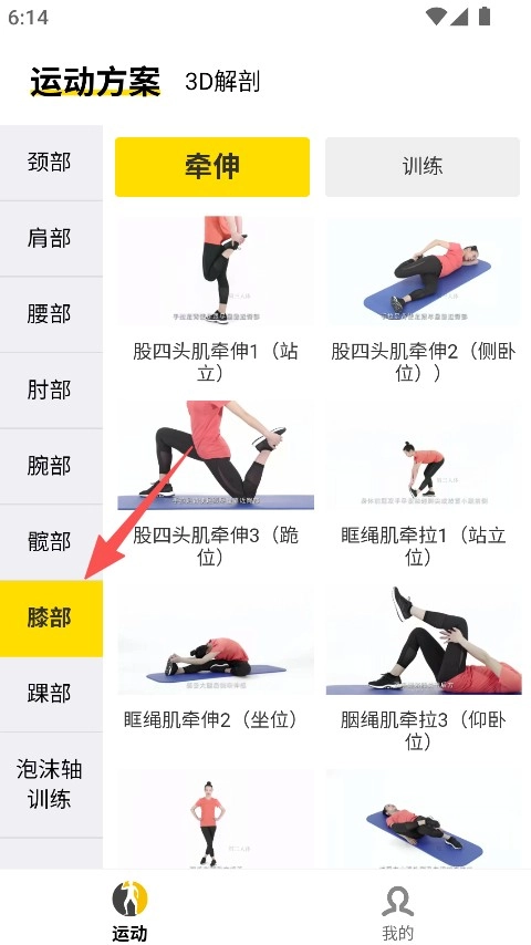 点击具体动作,如股四头肌牵伸,查看动作说明。