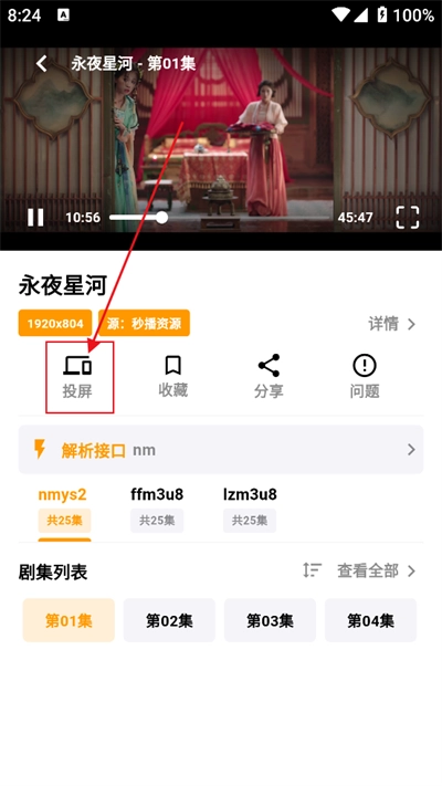 一键打开,进入播放详情页,点击"投屏"按钮。