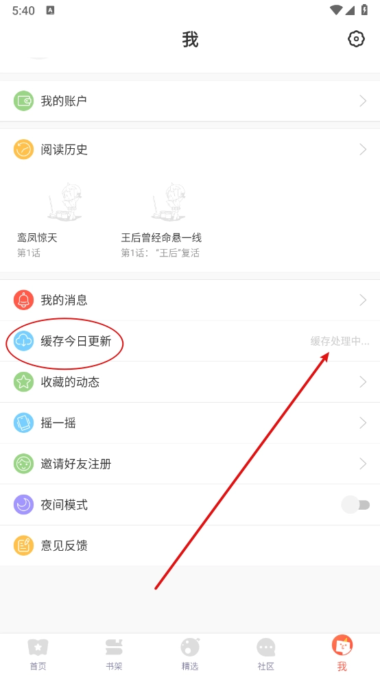 接着进入“我的”页面,点击“切换为今日更新”,参照图示,等待缓存完成后,就能离线观看了。
