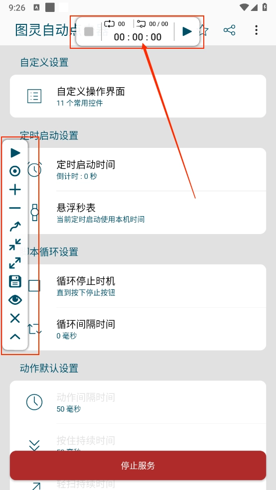回到首页就能开始使用啦,左侧的栏目用来控制点击操作,顶部区域点击后可以启动计时功能。