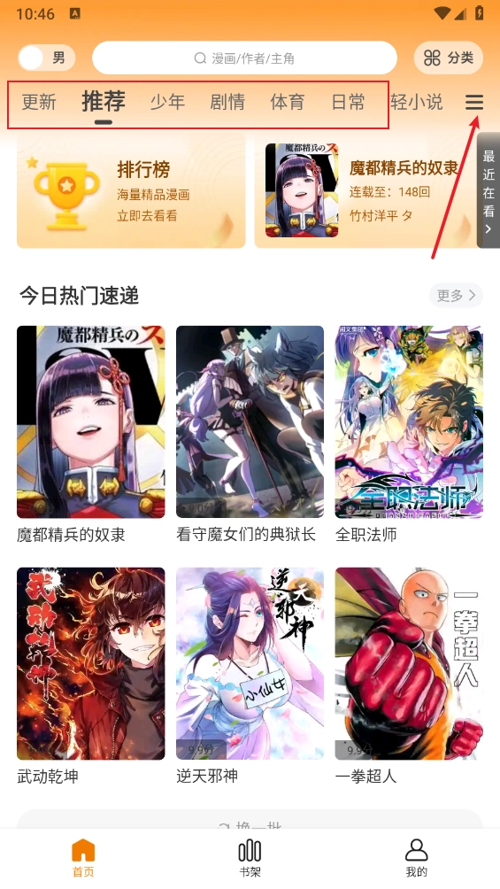 进入首页后,你可以依据顶部的题材分类来浏览自己喜欢的漫画,点击右上角的三条横线图标即可进入相应界面。