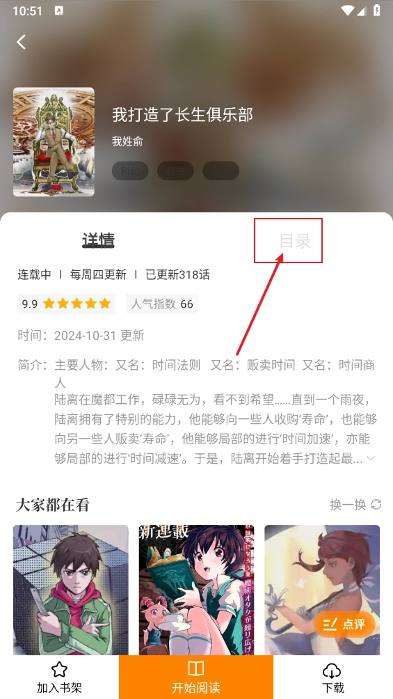 在漫画阅读详情页,点击"目录"即可进行查看。