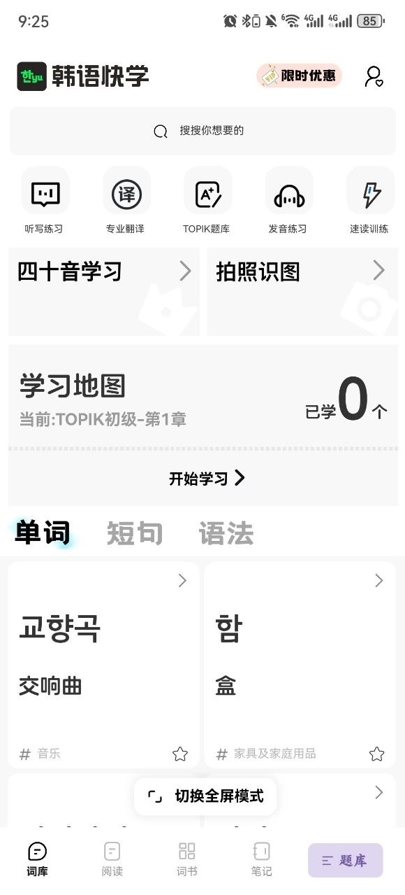 韩语快学,这款专业又好用的一站式韩语学习神器,从最基础的四十音、进阶的高级语法到TOPIK备考,都提供系统的教学内容。发音练习、单词记忆、情景对话等功能一应俱全,搭配智能纠错功能,助你说出地道的韩语,全方位满足你的韩语学习需求。