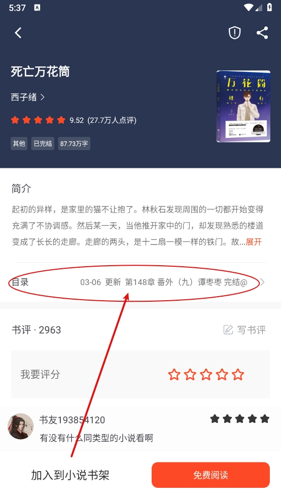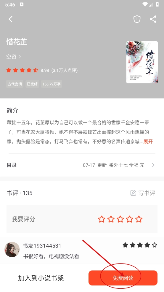 进入小说详情页,点击"免费阅读"。