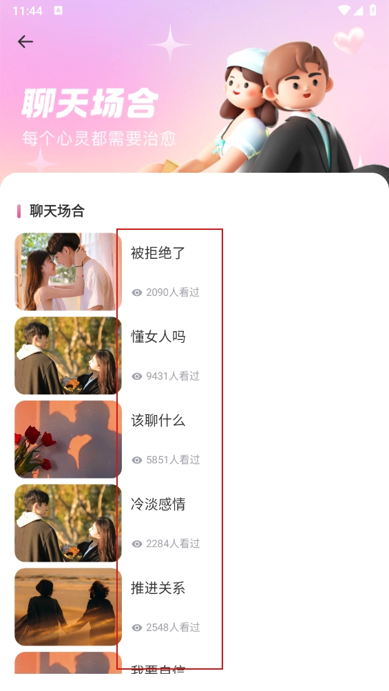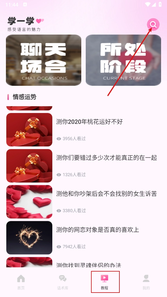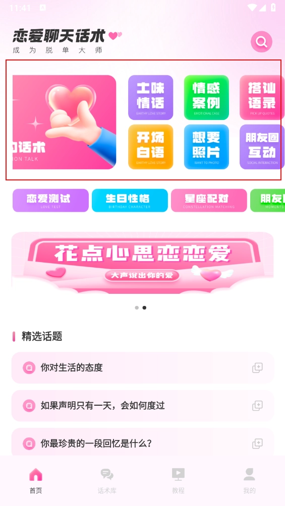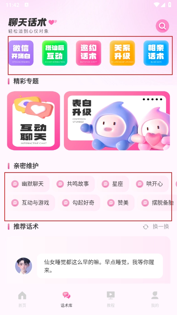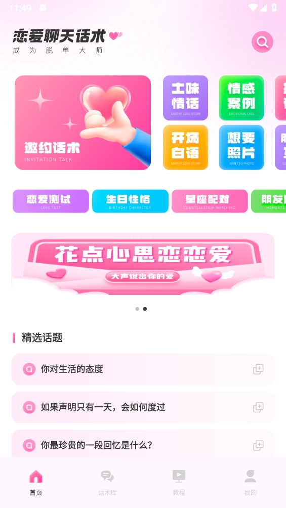 打开软件后,里面包含了多个恋爱技巧相关的板块,只需一键点击,就能直接进入对应的功能使用。