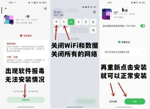 软件安装时若弹出报毒提示,且未出现安装按钮,可开启飞行模式或断开网络,随后重新进行安装操作即可。