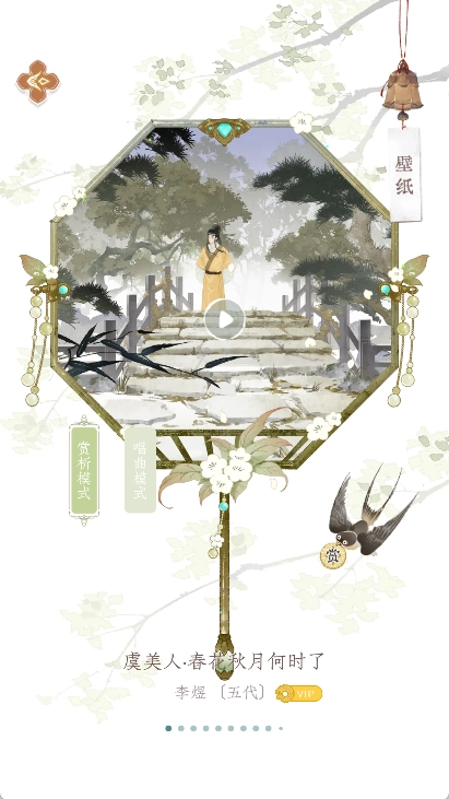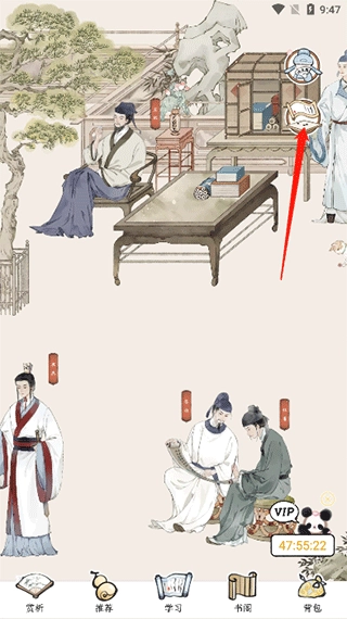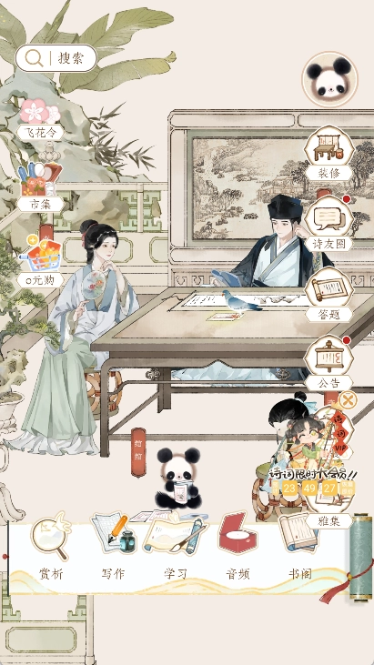 打开软件进入主页的庭院场景后,就能看到李白、杜甫等古代文人的形象,点击这些形象即可跳转至对应的词句解析页面。