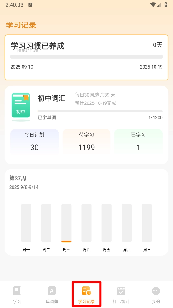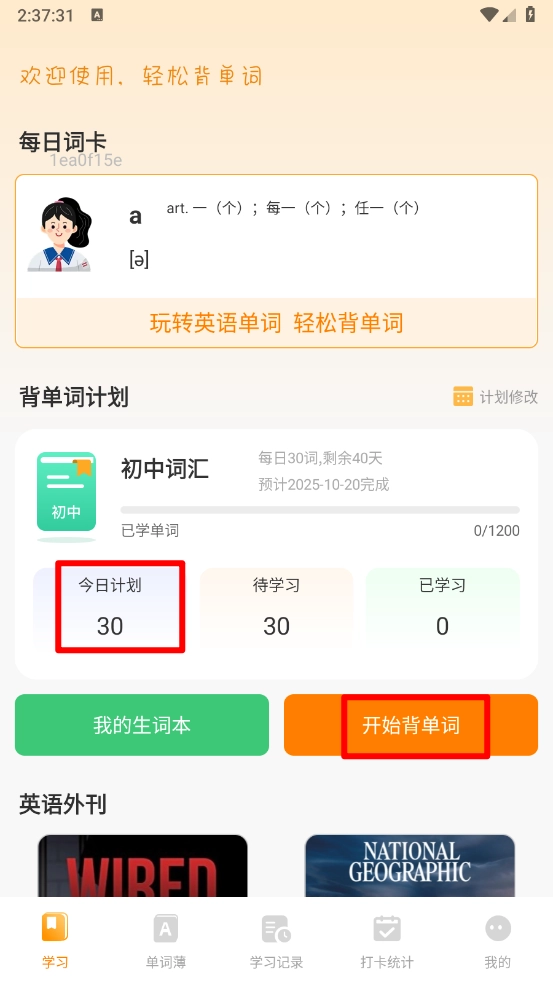 进入学习板块后,可依据自身需求设定背单词计划,随后点击“开始背单词”按钮即可进入背单词界面。