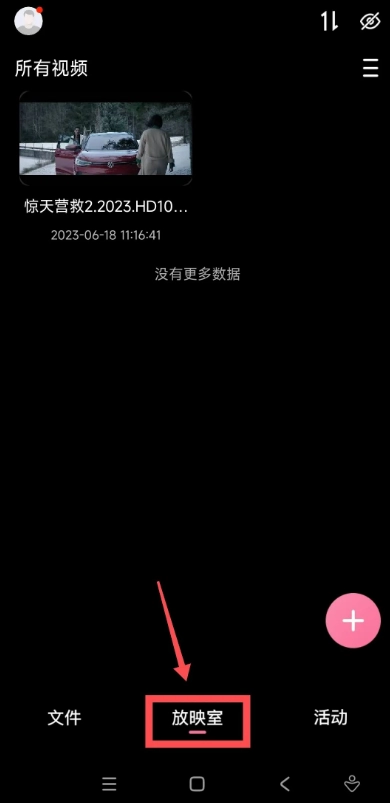 点击底部的放映室,就能看到我们之前保存的所有影视资源!右下角的加号按钮,可直接添加更多资源链接。