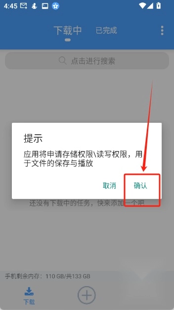 进入首页后,点击页面中间的“+”号图标,此时系统会弹出权限请求提示,需要用户点击“确认”按钮,以开启手机的存储权限。