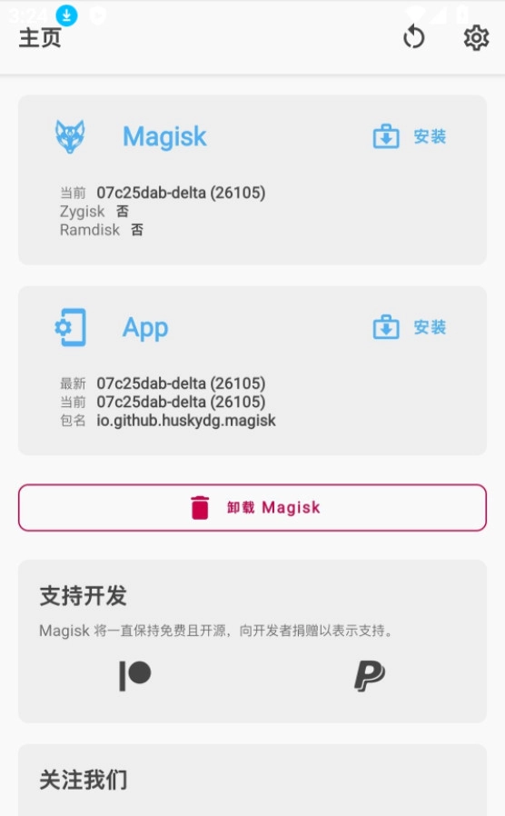 好的Kitsune Mask新版本,进入首页后,找到Magisk栏目里的「安装」选项(位置如图所示),点击进入新页面,然后选择「直接安装」开始安装流程,安装完成后重启手机即可。
