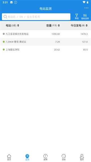 监控电站的发电状况:进入检测界面,查看各电站的容量及每日发电量。