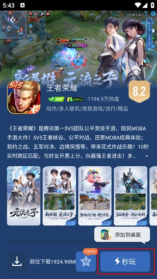 在搜索结果里找到你想玩的游戏并点击,进入详情页面后,留意右下角的“秒玩”按钮,点击它就能直接进行云游玩了。